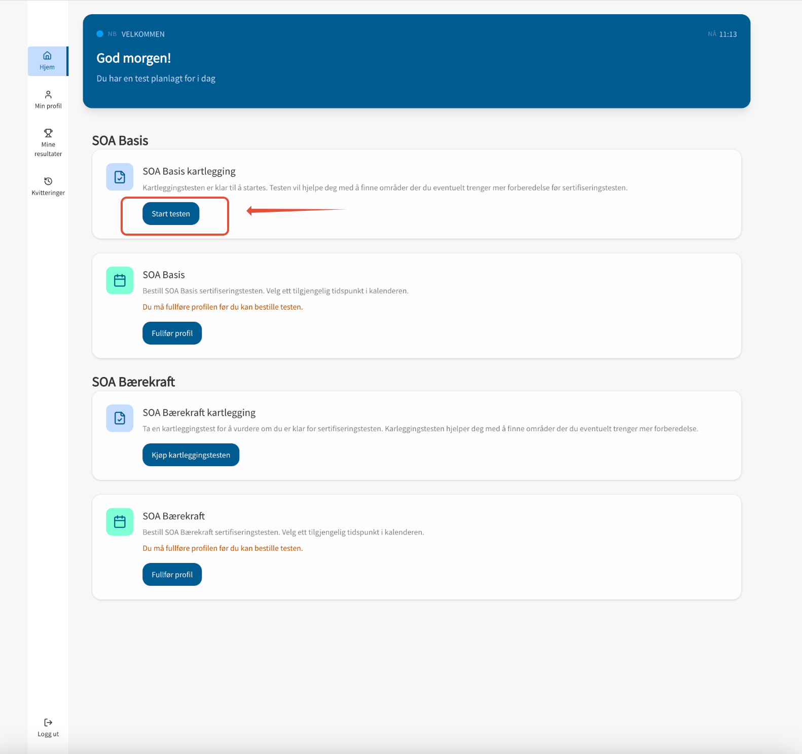 Eksempelet i denne artikkelen viser hvordan man gjennomfører en SOA Basis kartleggingstest. Vi viser ikke gjennomføring av SOA Bærekraft kartleggingstest, men det fungerer på samme måte som gjennomføring av SOA Basis kartleggingstesten.Før du kan gjennomføre en kartleggingstest må du registrere deg og kjøpe tilgang.