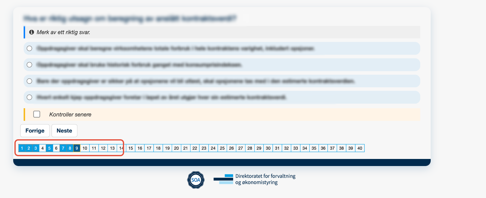 - Du kan bruke knappene "Forrige" og "Neste", eller trykke på tallene i progresjonsbaren, for å navigere deg frem, og tilbake mellom oppgavene i testen.
