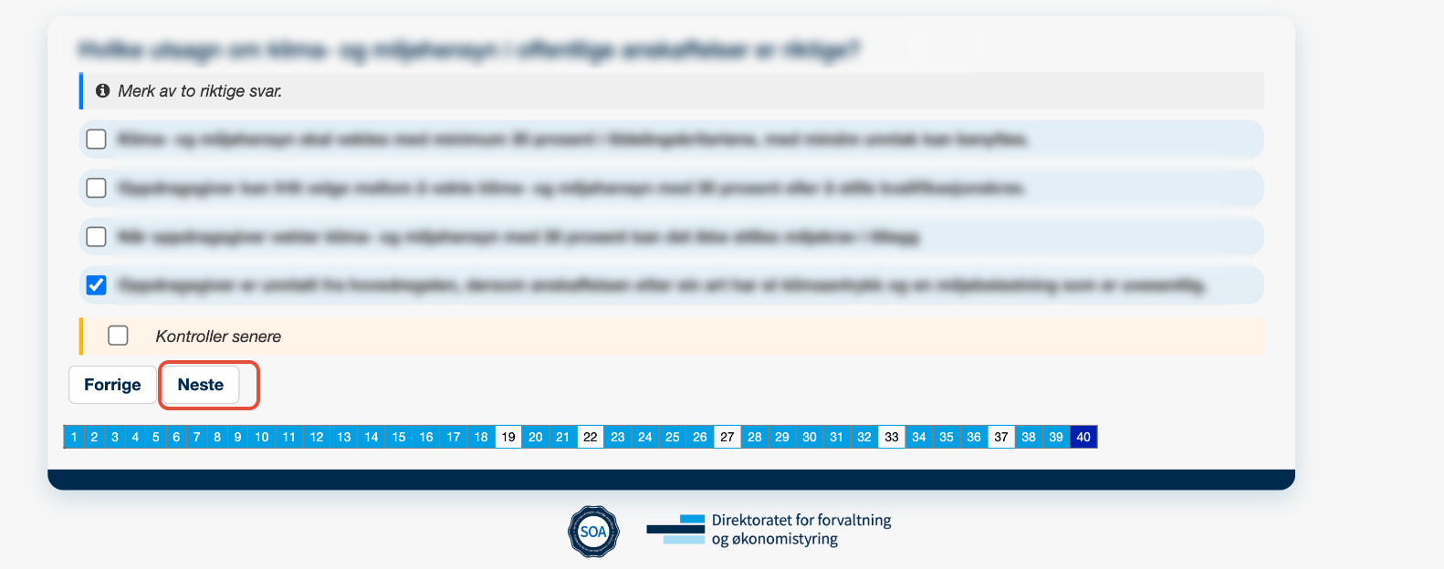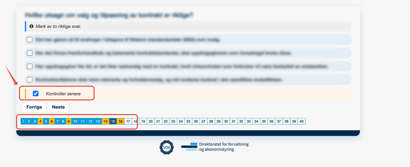 - Det er også mulig å bokmerke oppgaver du ønsker å kontrollere senere. For å gjøre dette huker du av på "Kontroller senere" nederst. Bakgrunnsfargen på oppgavenummeret på progresjonsbaren vil da endre seg til gul.