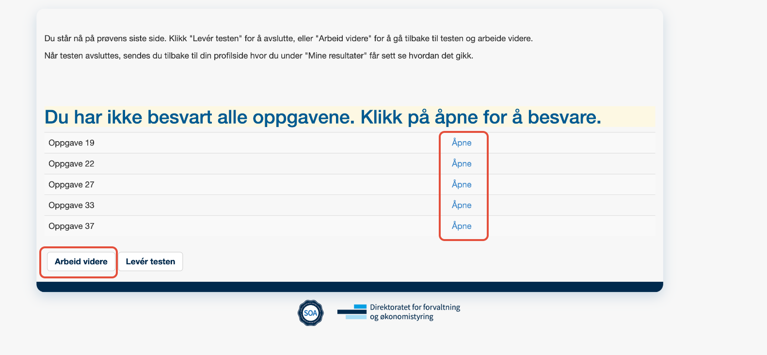 - Om du har ubesvarte oppgaver før levering vil du få opp denne siden. Om du ønsker å besvare dem, klikk enten på Arbeid videre, eller klikk på Åpne til høyre for de oppgavene som er ubesvart. Da vil du komme direkte tilbake til den oppgaven.