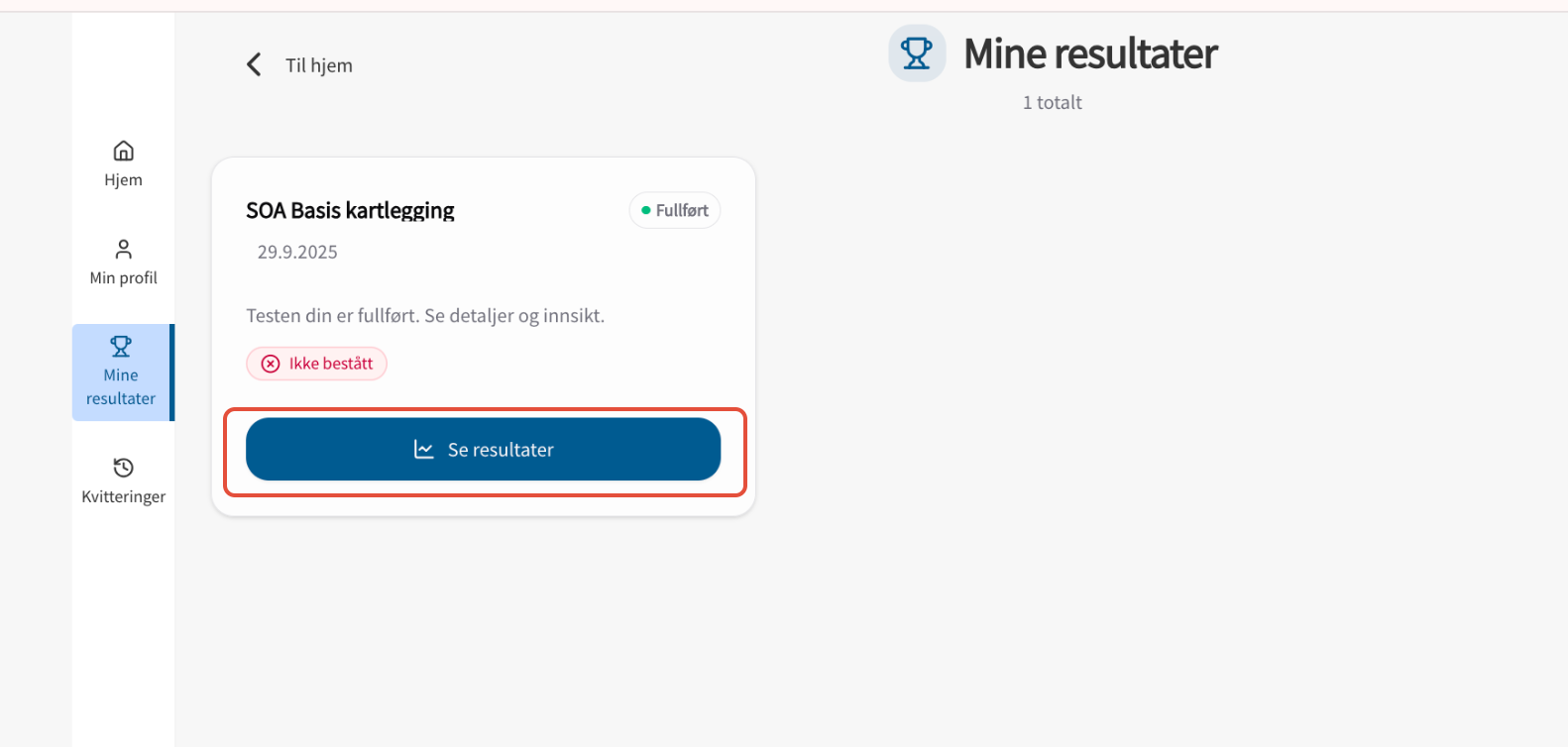 - Etter innlevering blir du sendt direkte tilbake til min side, og Mine resultater. På denne siden ser du testhistorikken din, og resultatet på testene du har gjennomført.