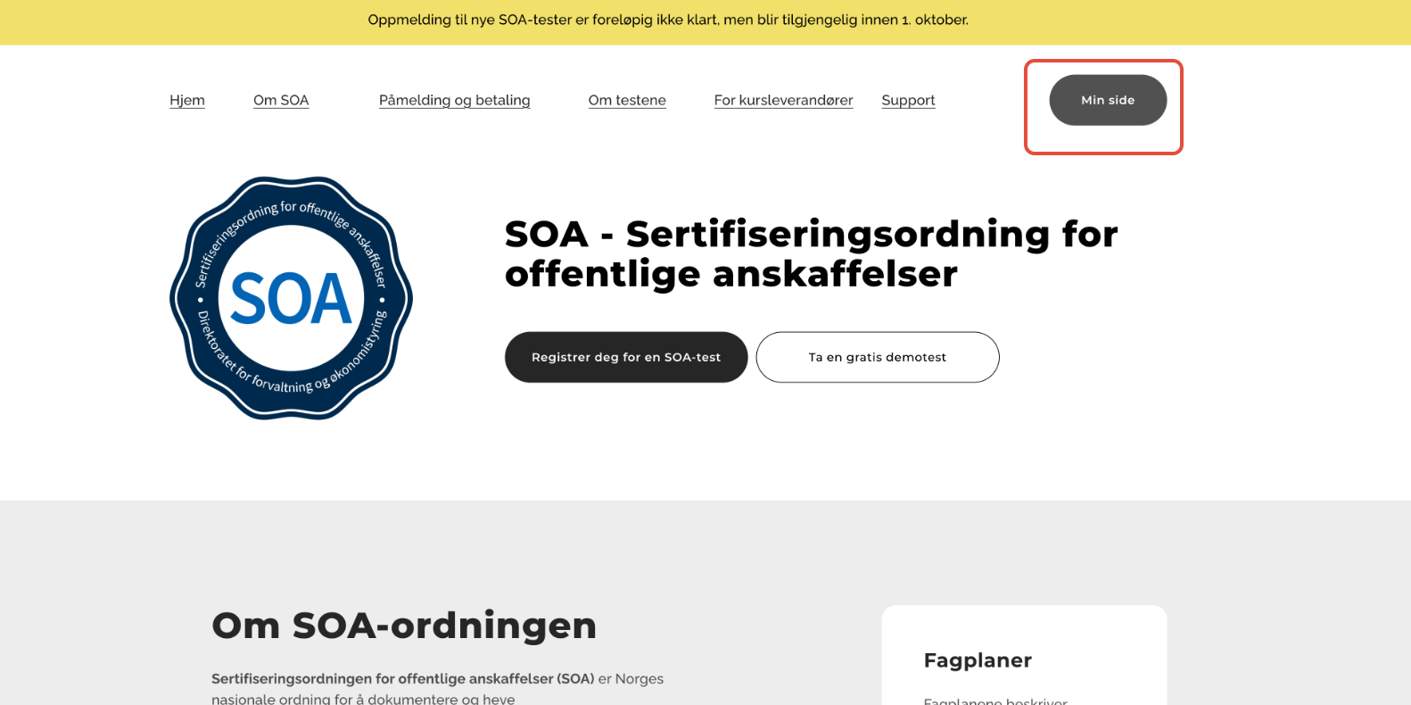 1) Gå til https://soa.enovate.no/ og klikk på Min side oppe til høyre