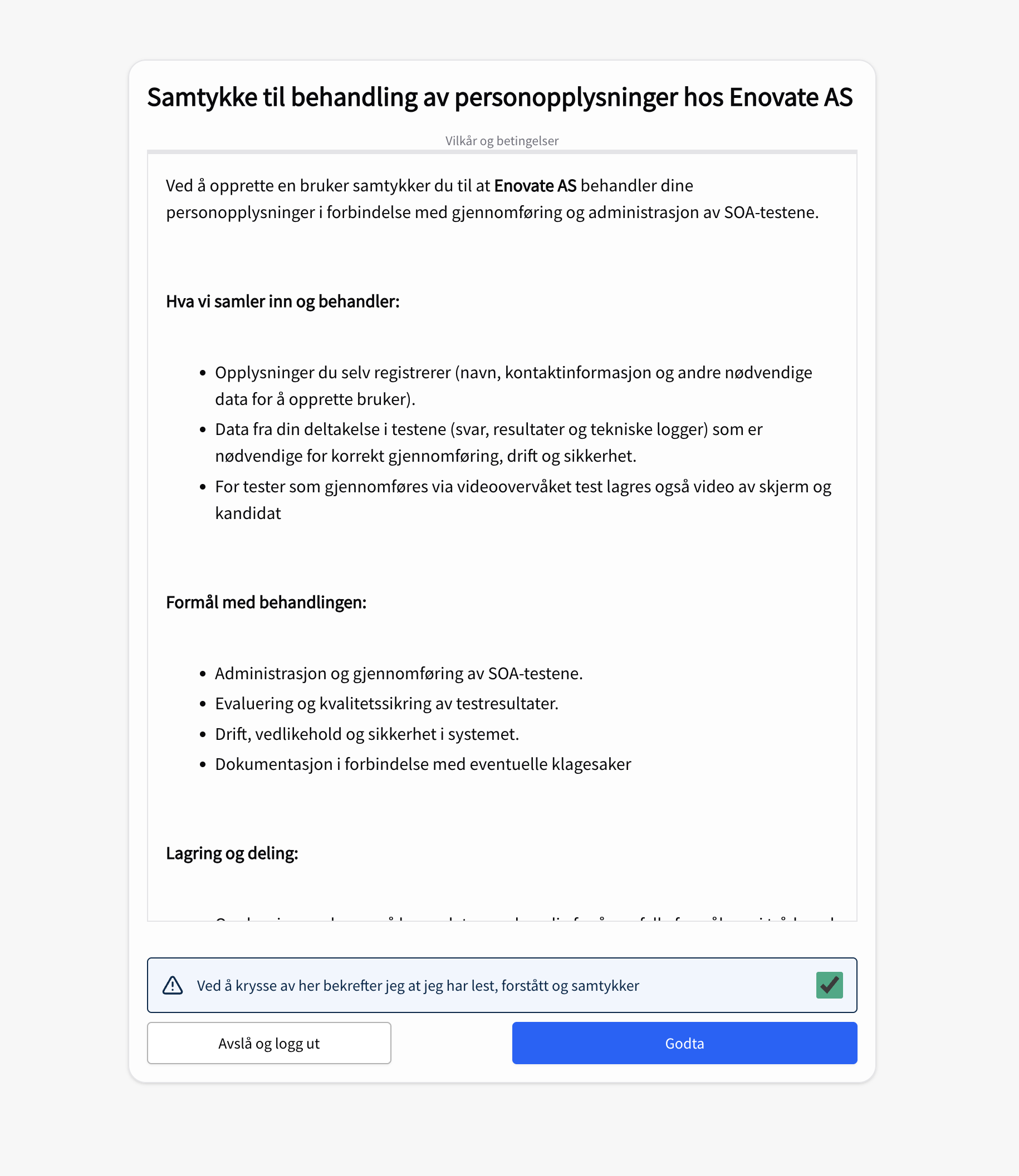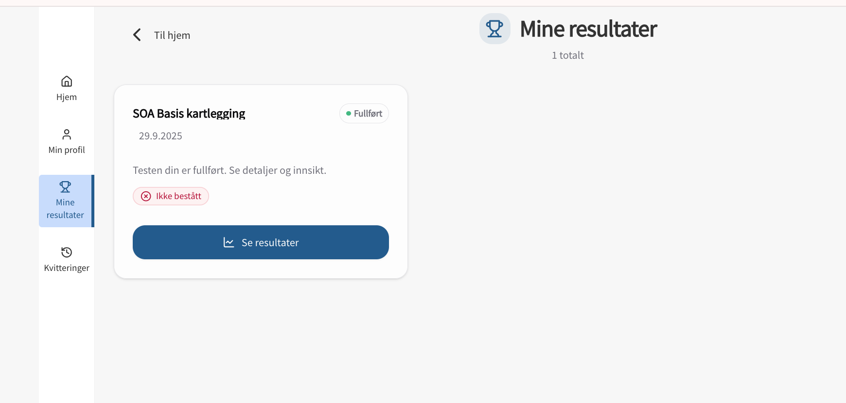 11) Dersom du ikke får importert tidligere resultat, forsøk først å verifisere med mobilen eller e-posten som ikke enda er verifisert. Om det ikke hjelper, ta kontakt med Enovate support på support@enovate.no for bistand med å sjekke opp i hvilket mobilnummer / hvilken e-post som du benyttet da du tok SOA-testen(e) via Norsk test.