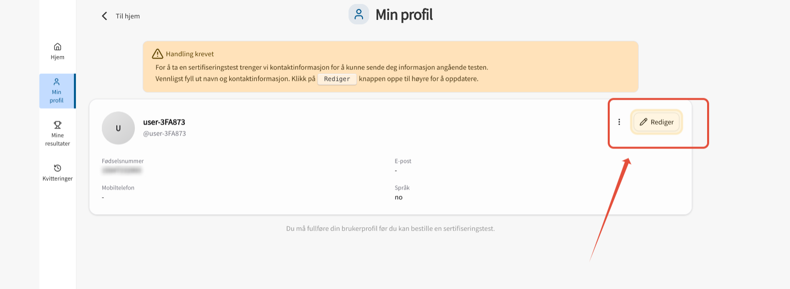 5) Klikk Rediger for å legge inn navn, e-post og mobilnummer. For å koble sammen data fra prøver tatt hos Norsk test, er det viktig at enten mobilnummeret eller e-posten samsvarer med hva du brukte hos Norsk test.