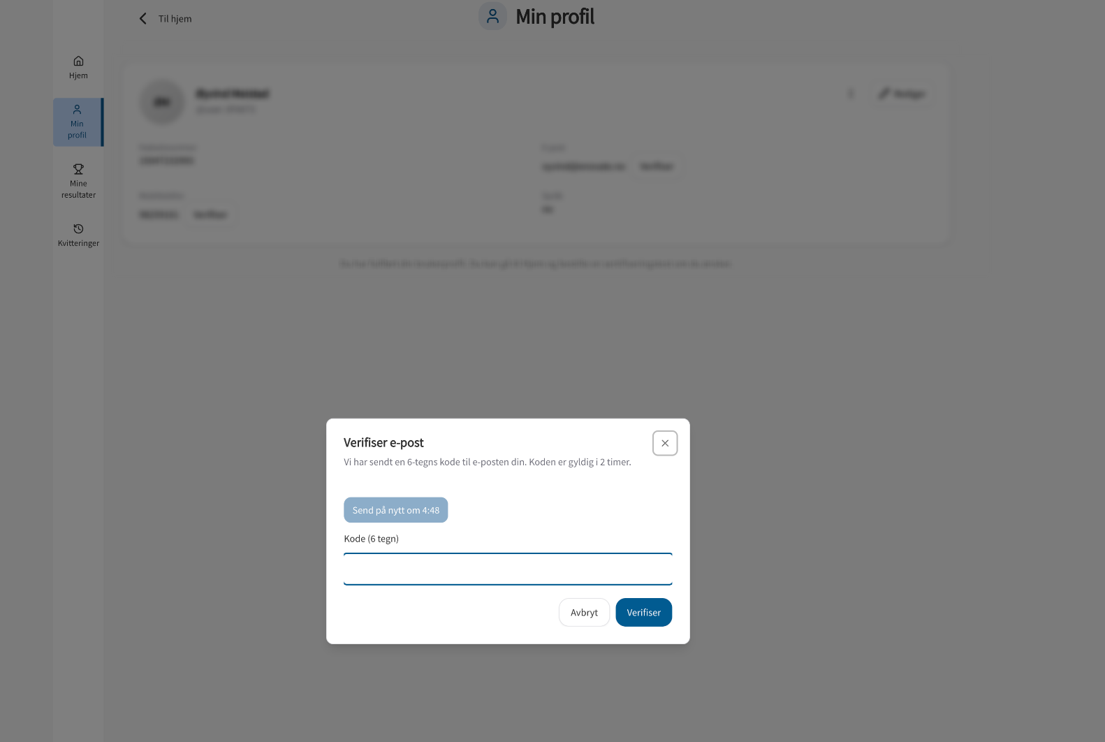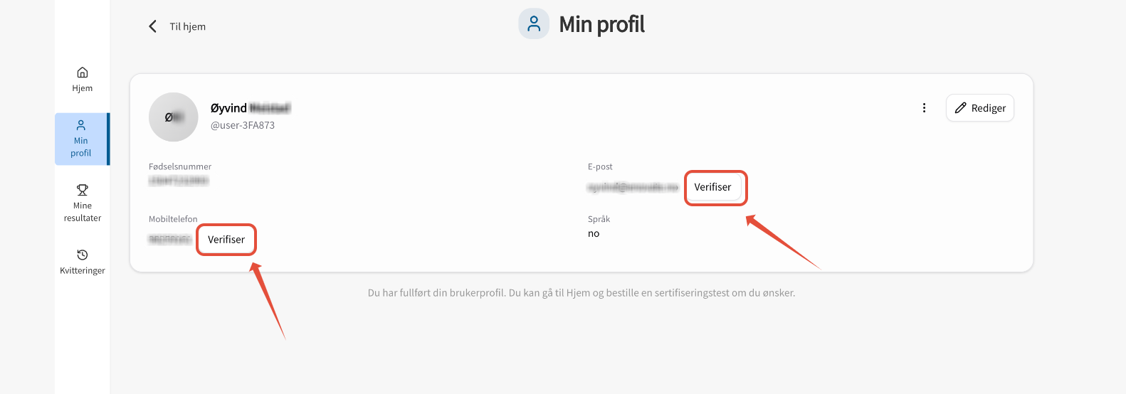 7) For å koble inn dine data fra Norsk test, klikk på Verfiser på enten mobilnummeret eller e-posten din.