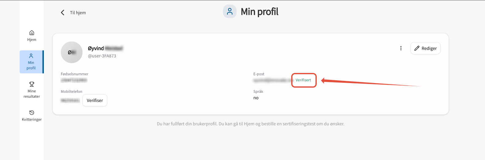 9) Når koden er verifisert, vil det stå verifisert på siden av mobilnummeret eller e-posten. Dersom e-posten eller mobilen ble brukt mot Norsk test, har dine tidligere resultatet nå blitt importer til din bruker.